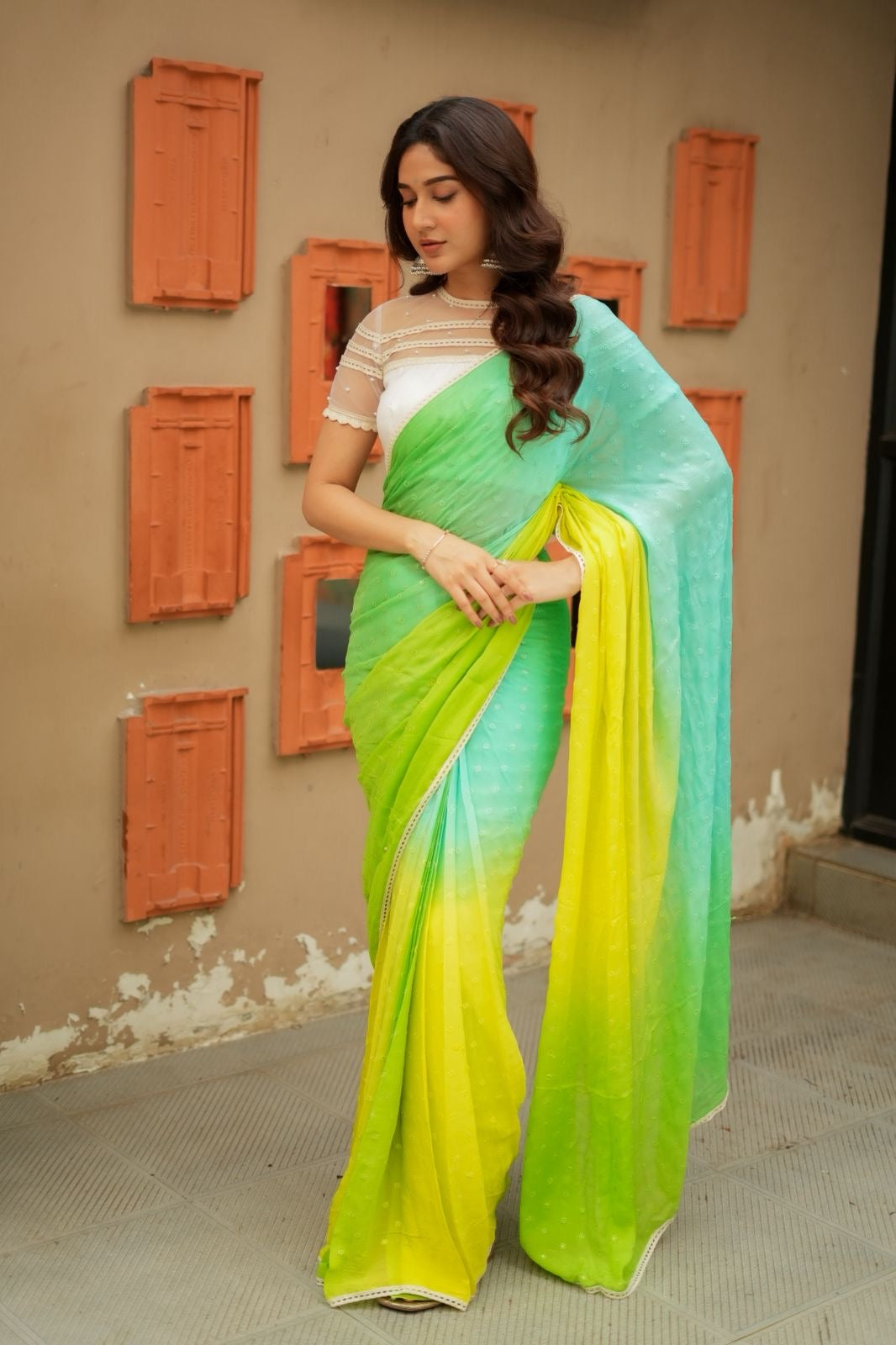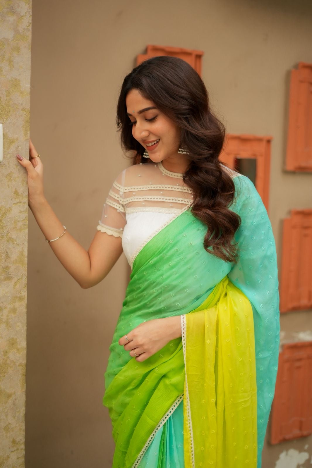White netted silk blouse comes with unique embroidery pattern works & beads hand works all over blouse as shown.