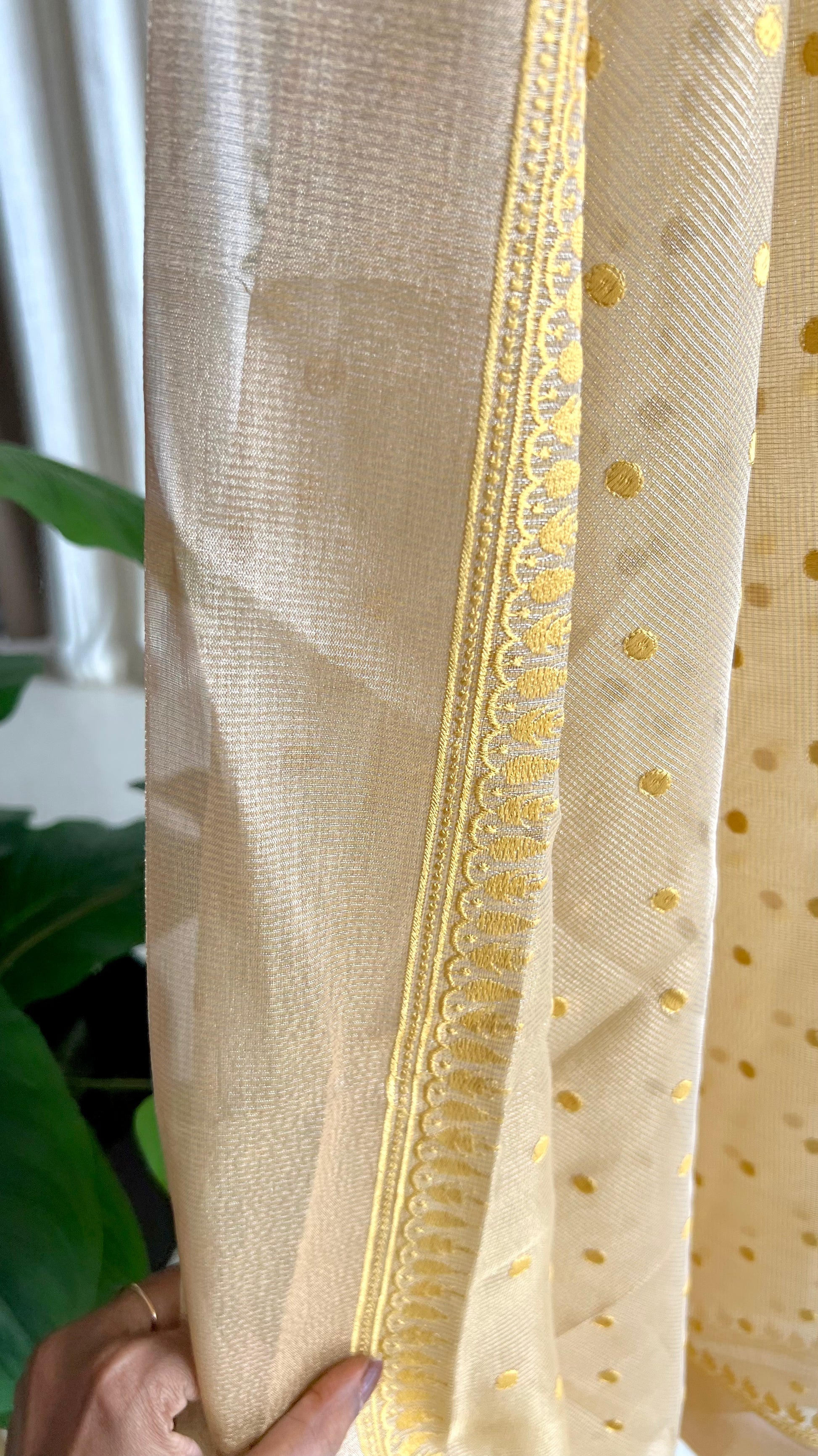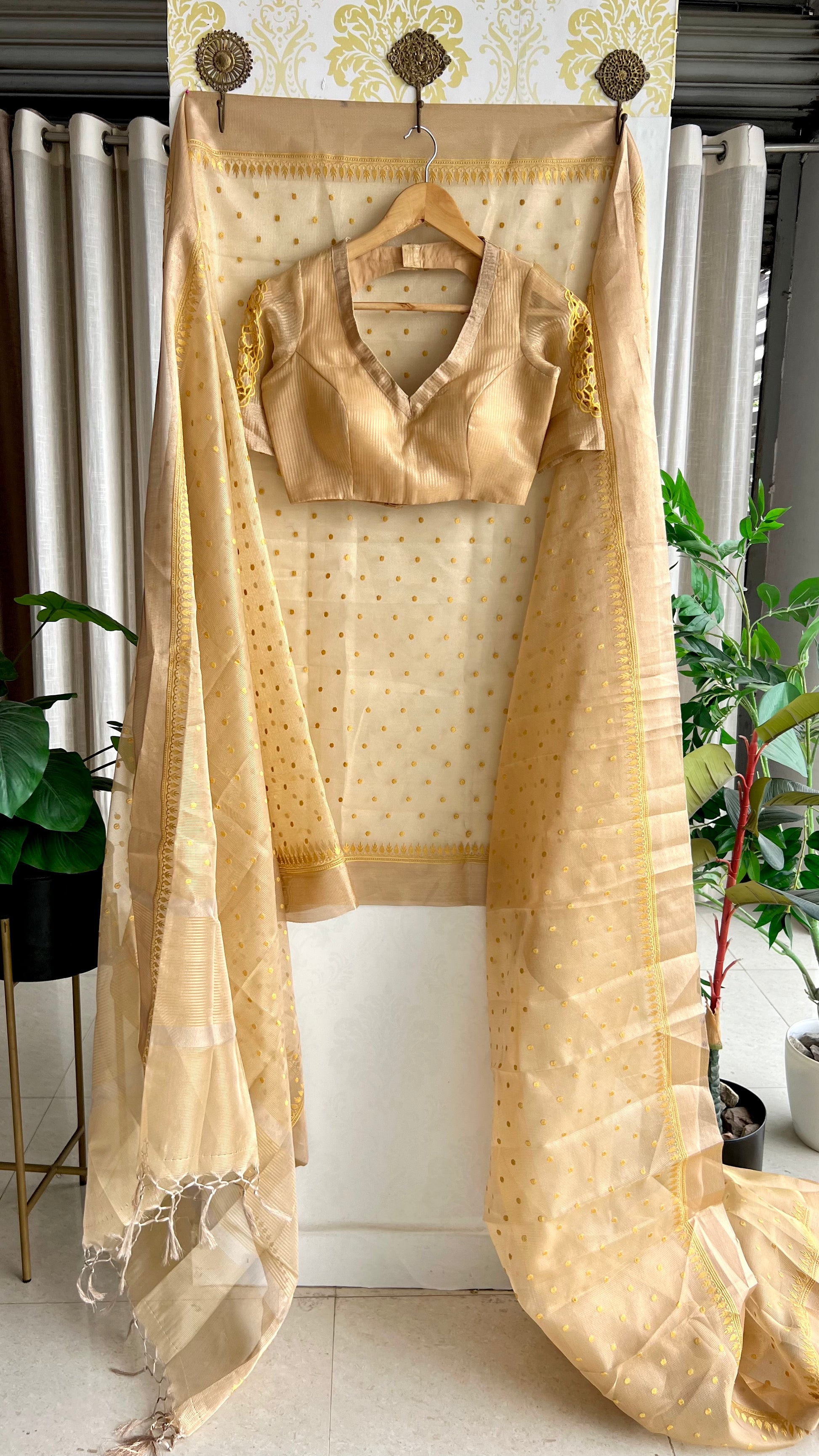 Gold kota doria saree with hand worked blouse