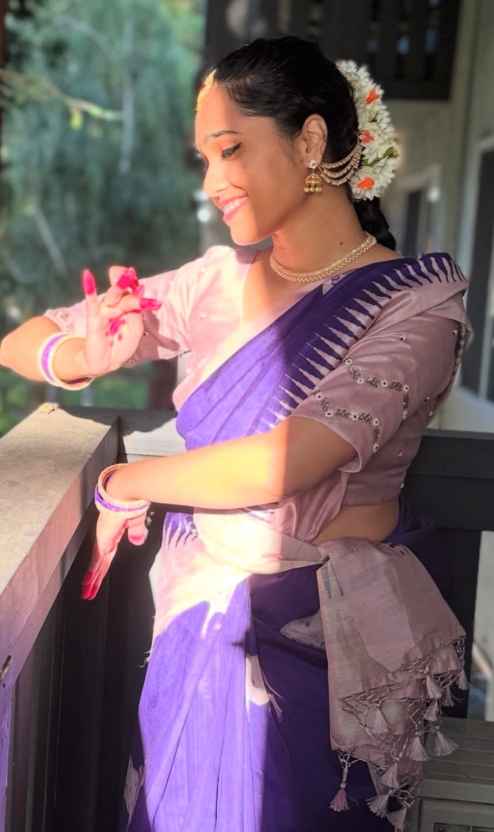 Purple tusser designer saree with cow prints all over saree & zari border, pallu comes with  powder pink silk embroidery V neck blouse having highlighted hand works for sleeves as shown