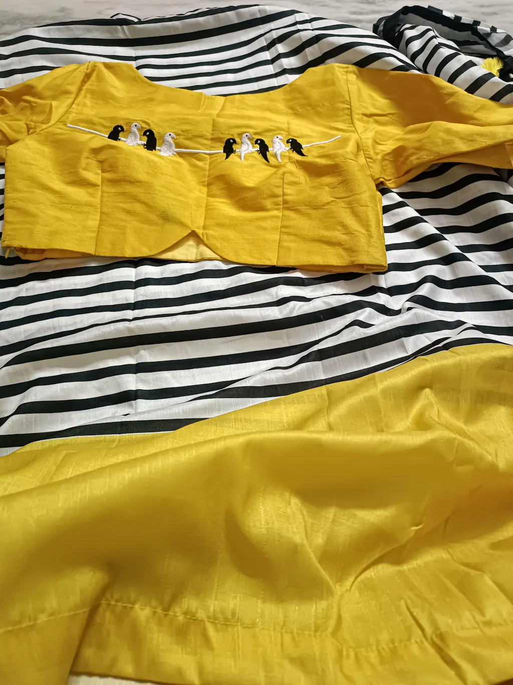 Black & white stripped kossa silk designer saree with liquid yellow border & pallu works is paired up with yellow bird motif embroidered blouse as shown.